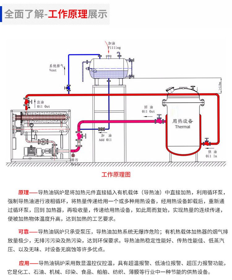 為熱用戶輸出高320℃的熱油;電加熱導(dǎo)熱油爐設(shè)備投資少:由于導(dǎo)熱油加熱系統(tǒng)簡(jiǎn)單,無(wú)水處理設(shè)備及更多的輔助設(shè)備、鍋爐承受低壓力等,所以整個(gè)系統(tǒng)投資較少.