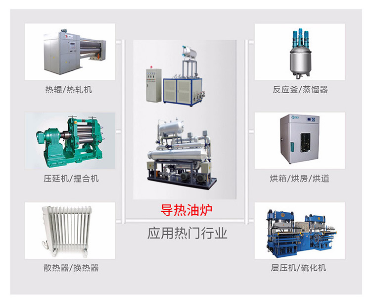 食品、化學(xué)工業(yè):聚合、縮合、蒸餾、熔融、脫水、強(qiáng)制保溫等;油脂工業(yè):脂肪酸蒸餾、油脂分解、濃縮、酯化、真空臭等反應(yīng)釜加熱、合成纖維工業(yè):聚合、熔融、紡絲、延伸、干燥等;紡織印染工作:熱定型輥筒加熱、烘房加熱、熱容染色等;非紡織工業(yè):無(wú)紡布等;飼料工業(yè):烘干等;塑料及橡膠工業(yè):熱壓、壓延、擠壓、硫化成型等。造紙工業(yè):干燥、波紋紙加工等。木材工業(yè):多合板、纖維板加壓成型、層壓板加熱、熱壓板加熱、油壓機(jī)控溫、木材干燥等。建材工業(yè):石膏板烘干、瀝青加熱、混凝土構(gòu)件保養(yǎng)等;機(jī)械工業(yè):噴漆、印花烘干等;