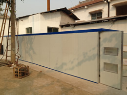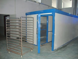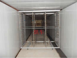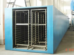 將待干燥的物料置于烘盤中,烘盤置于烘干車上,烘干車從干燥室入口依次進入,與此同時,熱風由供風系統從干燥室出干料端送入,與烘干車運行逆向,與物料進行充分的接觸。干燥室自動控溫,濕氣由排濕風機自動排出。