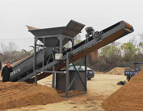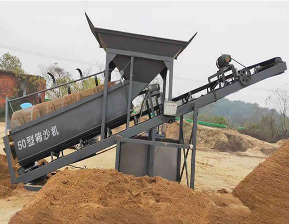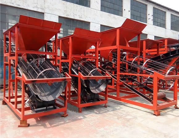 滾筒篩沙機(jī)是仿照人工利用斜面篩網(wǎng)篩砂的工作原理,采用平置滾篩筒,并保證料流在篩筒中的多圈內(nèi)螺旋葉片間可連續(xù)滾篩五圈以上,從而使砂料反復(fù)翻滾、滑動而充分離散、分離;滾筒式篩沙機(jī)不同于斜置滾篩引起的大小料相互推擠、埋壓,篩分過程匆忙;也不同于斜置滾篩或斜置振動篩所引起的大小料相互沖擠或大料托小料振跳而引起的篩分不干凈、混料現(xiàn)象。滾筒篩內(nèi)的打砂裝置,可對呈團(tuán)砂塊打碎、打散。滾篩網(wǎng)面安裝的網(wǎng)面清理裝置可對粘附砂土自行清理以防堵塞網(wǎng)孔。