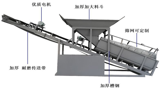 鏟車將毛料鏟入上料斗,經(jīng)傳送入轉(zhuǎn)篩,轉(zhuǎn)篩將毛料分離,沙子經(jīng)出料口傳到沙,石子經(jīng)出料口傳到石子 。