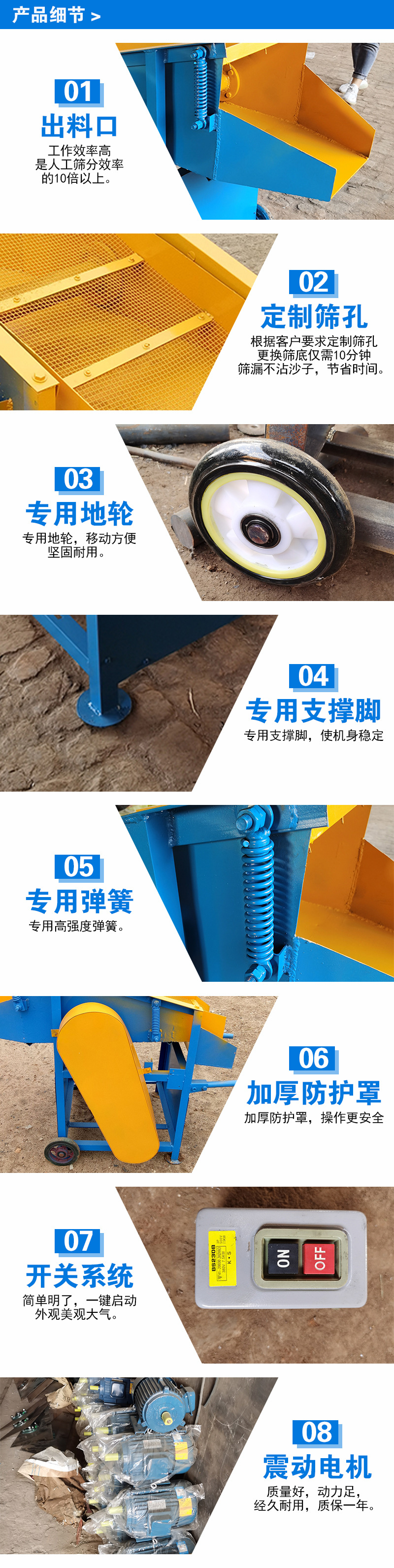 2、電動篩土機在運行時不準檢修、注油、調整、觸摸。設備檢修或清理時應關閉(切斷)所有總、分電源,并掛攀上禁止合閘,有人工作 - 示 - 。鏟車裝卸砂時,不準撞擊土壤篩土機,放料時應緩慢均勻給料,不準猛砸,以免設備發生變形影響使用。雨天應停止工作,對電機、閘箱應做防水處理,以免造成安全事故.