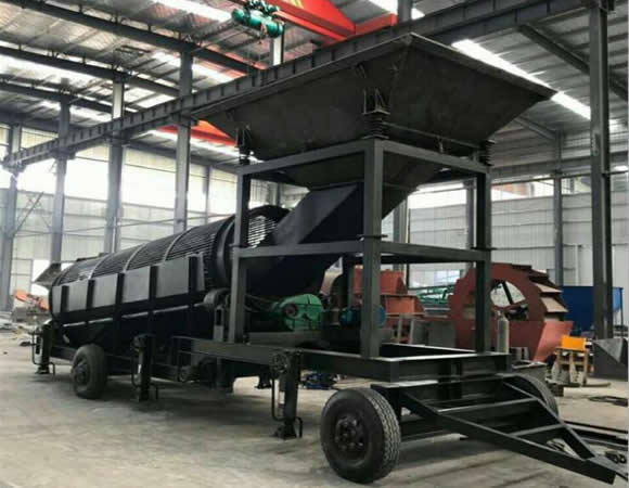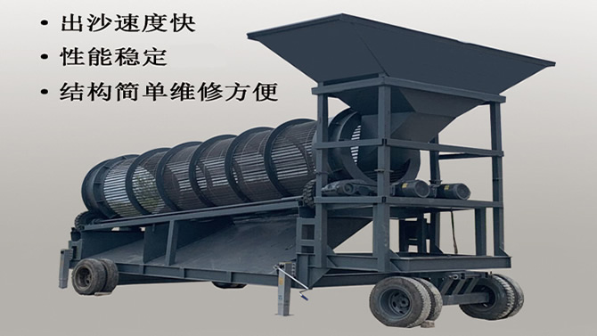 移動式砂石滾筒篩主要有電機、減速機、滾筒裝置、機架、密封蓋、進出料口組成。整體與地平面成傾斜狀態,外部被密封隔離罩所密封,以防止污染環境。通過變速減速系統使篩分筒在一定轉速下旋轉,物料自上而下通過篩分筒得到分離,細料從篩分筒前端下部排出,粗料從篩分筒下端尾部排出。